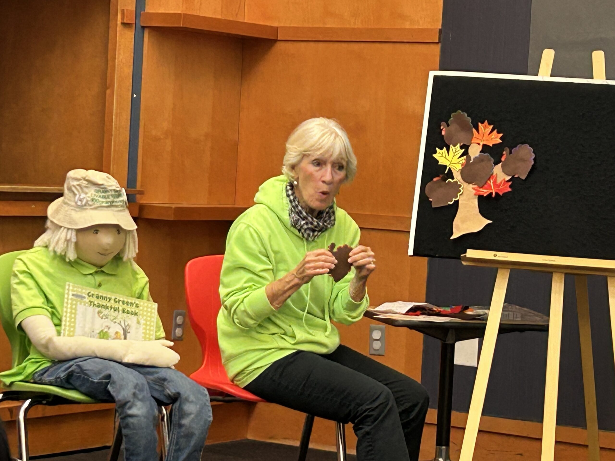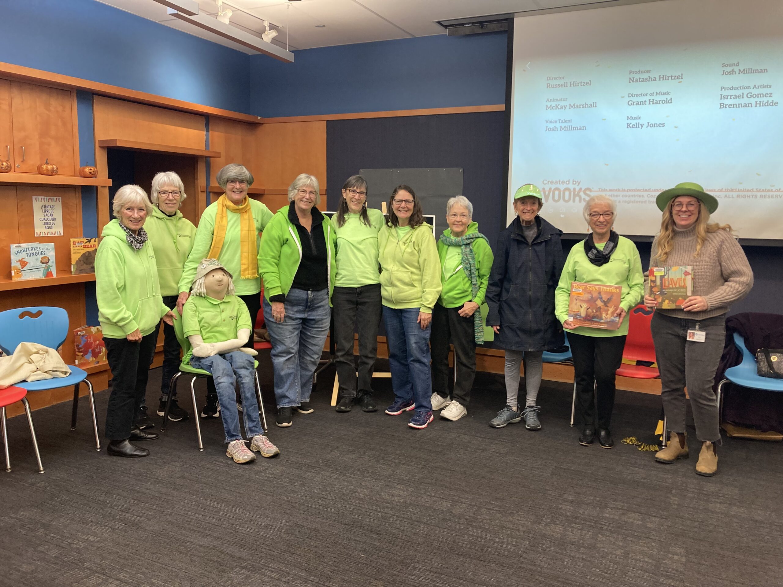 Grannies wore their green for a storytelling time at the Iowa City Public Library on November 20, 2025. Special thanks to Mari R at the library who leads us so well! Becky H showed a book up close to the children and commented that they were so sweet and a joy to be around.